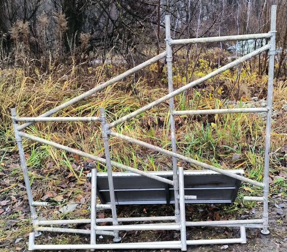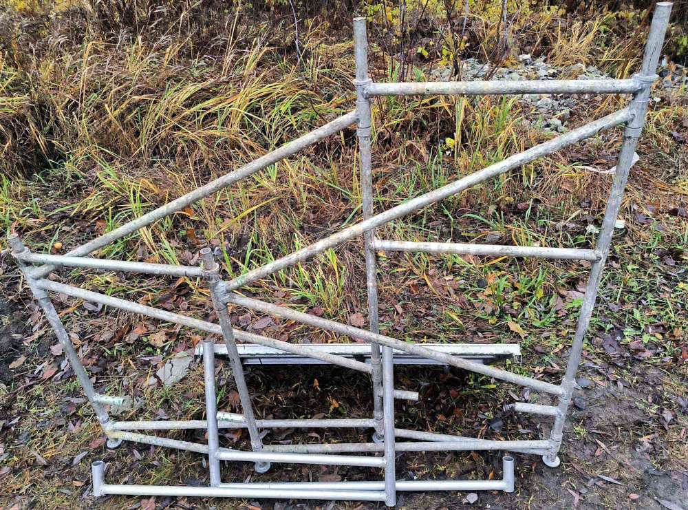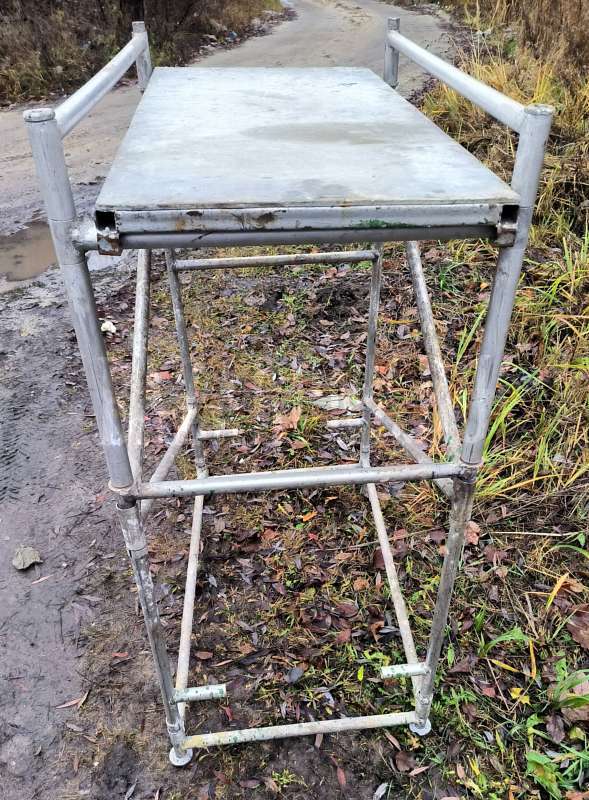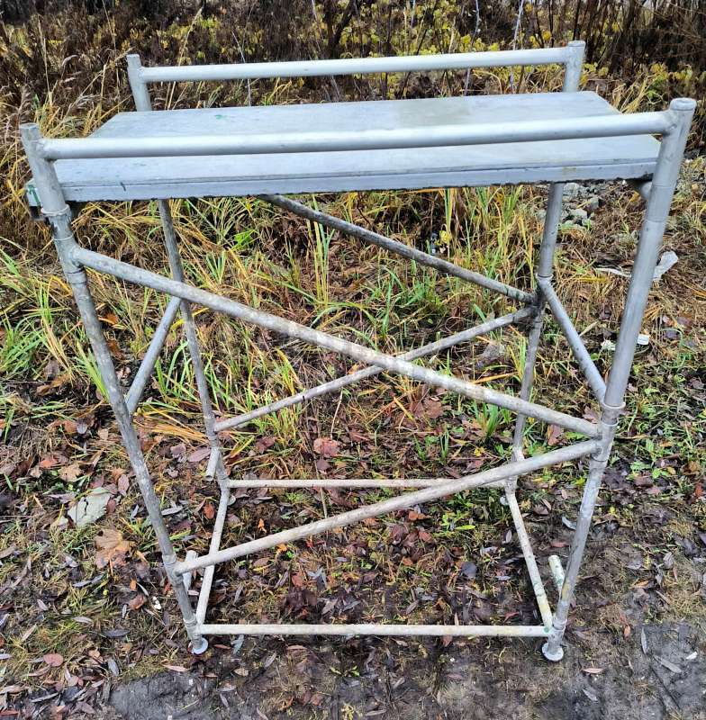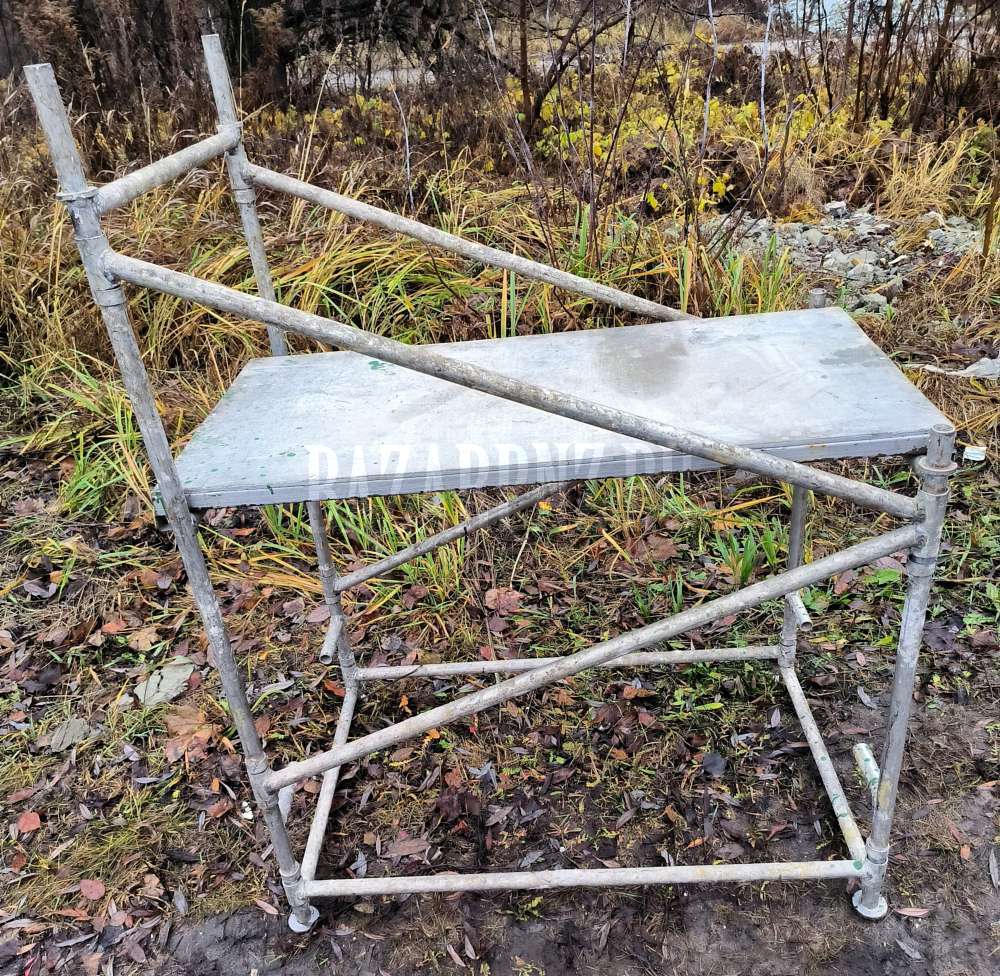 Стол-подмости ( штукатурный столик), складной алюминиевый, можно работать на лестничных маршах. Два уровня высоты для настила: 0, 9 и 1, 3 метра от пола. Рабочая площадка 1 х 0, 65 метра.