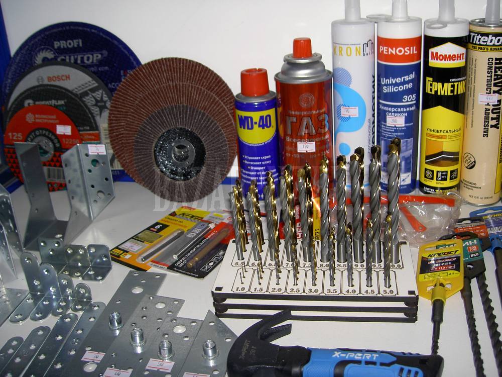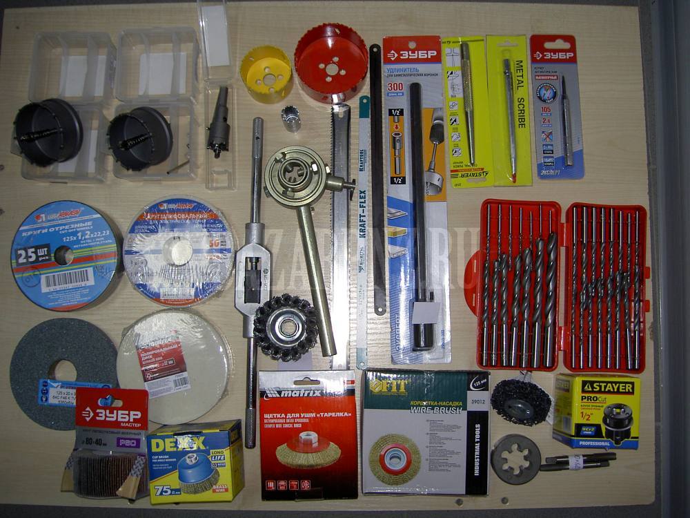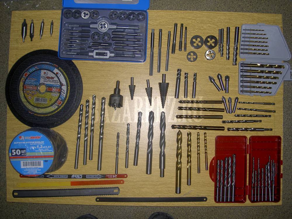 Для обработки металлов: свёрла Р6М5, свёрла с нитрид титановым покрытием и Р6М5К5 (кобальтовые). Свёрла с проточенными и шестигранными хвостовиками. Свёрла левые, ступенчатые, центровочные. Свёрла по металлу длиной 300 мм. Развёртки, фрезы, зенкеры, плашки, метчики, коронки, круги отрезные. Свёрла и коронки по дереву. Свёрла алмазные, круги, коронки (на дрель и УШМ) и чаши алмазные, полотна и ножовки, ножницы, щётки, электроды и многое другое